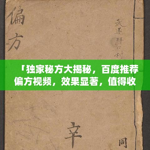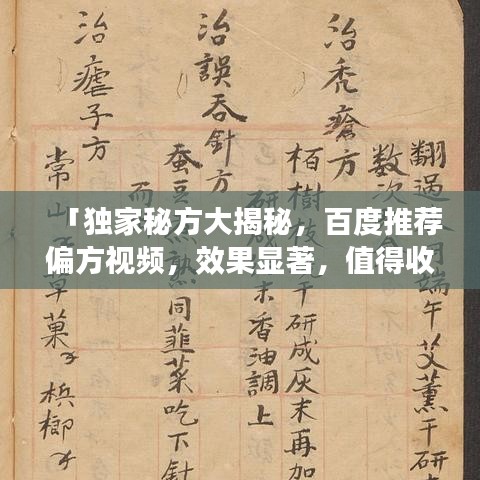 随着互联网的普及,越来越多的人开始寻找各种信息,其中偏方视频成为了很多人关注的焦点,我将结合关键词“偏方视频推荐一下吧百度”,为大家推荐一些实用的偏方视频。