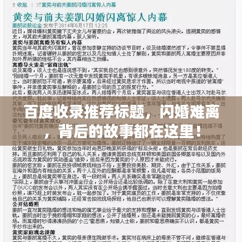 当我们遇到闪婚难离的问题时,可以通过百度搜索来寻找答案,百度搜索汇聚了海量的信息和资源,可以帮助我们了解闪婚难离的现象、原因和解决方法,通过搜索相关的文章、论坛和博客,我们可以了解到更多人的经验和看法,从而更好地应对婚姻问题。